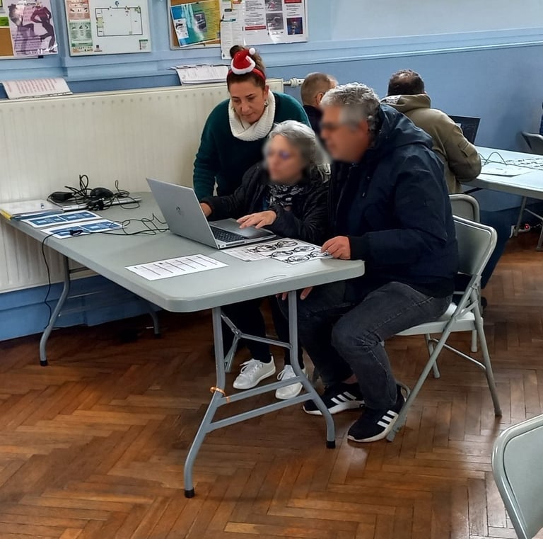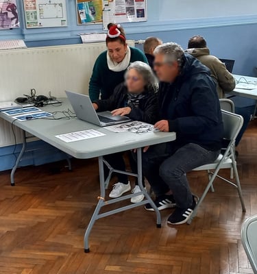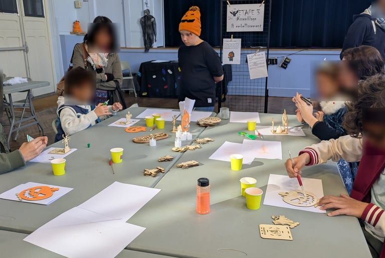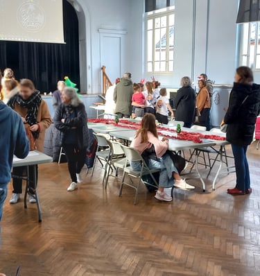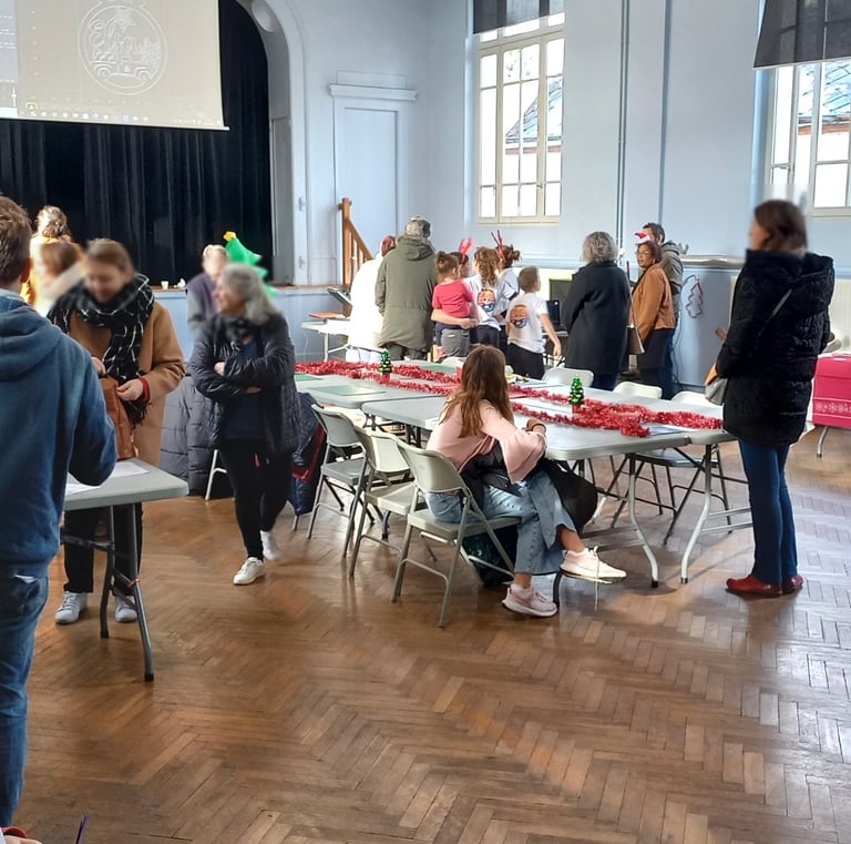 Accueil du public dans la salle municipale. Les gens préalablement inscrits pouvaient s'installer à un atelier par famille pour réaliser un objet de Noël : boule découpée au laser, un tote-bag personnalisé ou un mug imprimé par sublimation.