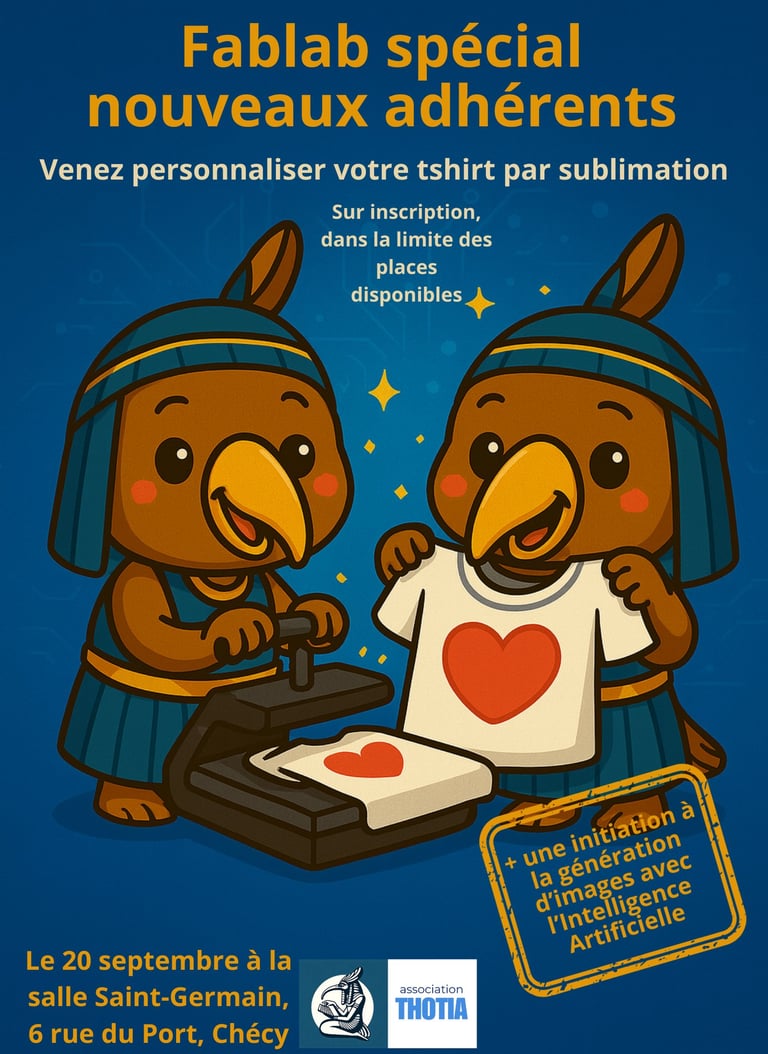 Pour cette occasion, THOTIA vous fera des démonstrations des divers appareils utilisés lors des Fablabs (découpeuse, graveuse laser, imprimante à sublimation) afin de personnaliser des objets (mugs, tshirt, etc...).