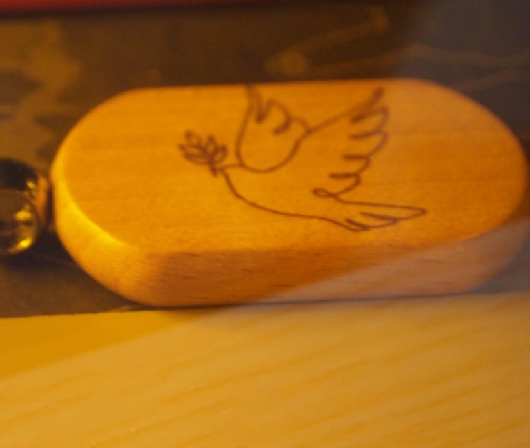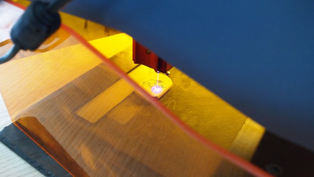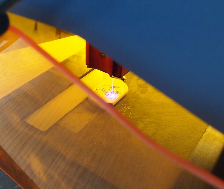 A droite, le graveur laser est en train de donner naissance à un porte clé en bois.