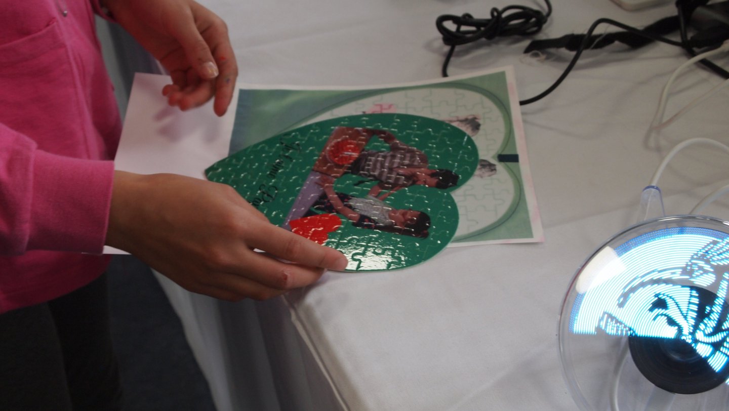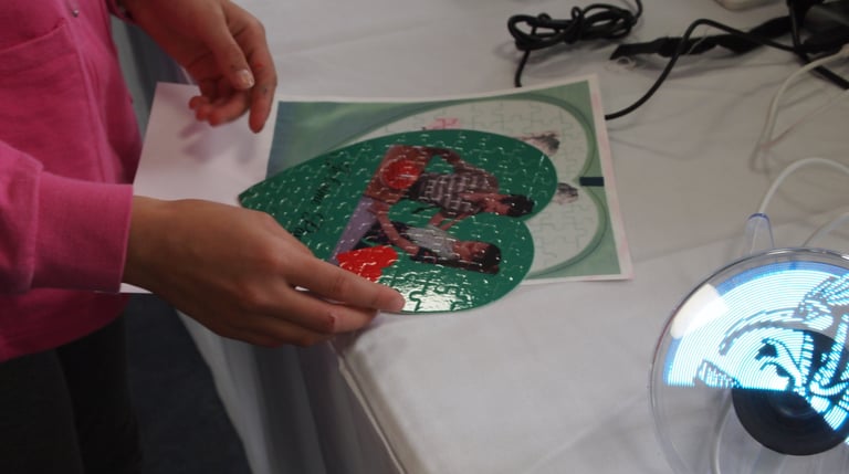 montrent les impressions par sublimation sur des puzzles ici en forme de cœur. Petits et grands ont pu profiter des explications pour comprendre cette méthode d'impression qui peut sembler "magique" quand le résultat est révélé.