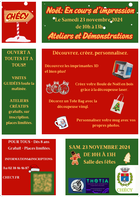 Nous organisons des ateliers dirigés pour permettre au public de créer des objets tout en découvrant des machines innovantes. Ces événements sont conçus pour rassembler petits et grands, familles et amis autour d’activités créatives et captivantes. En offrant ces sessions, nous souhaitons encourager la curiosité et l'enthousiasme pour la création, tout en renforçant les liens communautaires. Ces ateliers représentent une excellente occasion d'apprendre en s'amusant, tout en stimulant l'intérêt pour les nouvelles technologies. Les participants repartiront non seulement avec leur création, mais également avec des souvenirs mémorables partagés avec leurs proches. Nous sommes convaincus que ces activités enrichiront la vie culturelle de votre commune et permettront à chacun de s'épanouir dans un environnement créatif et bienveillant.